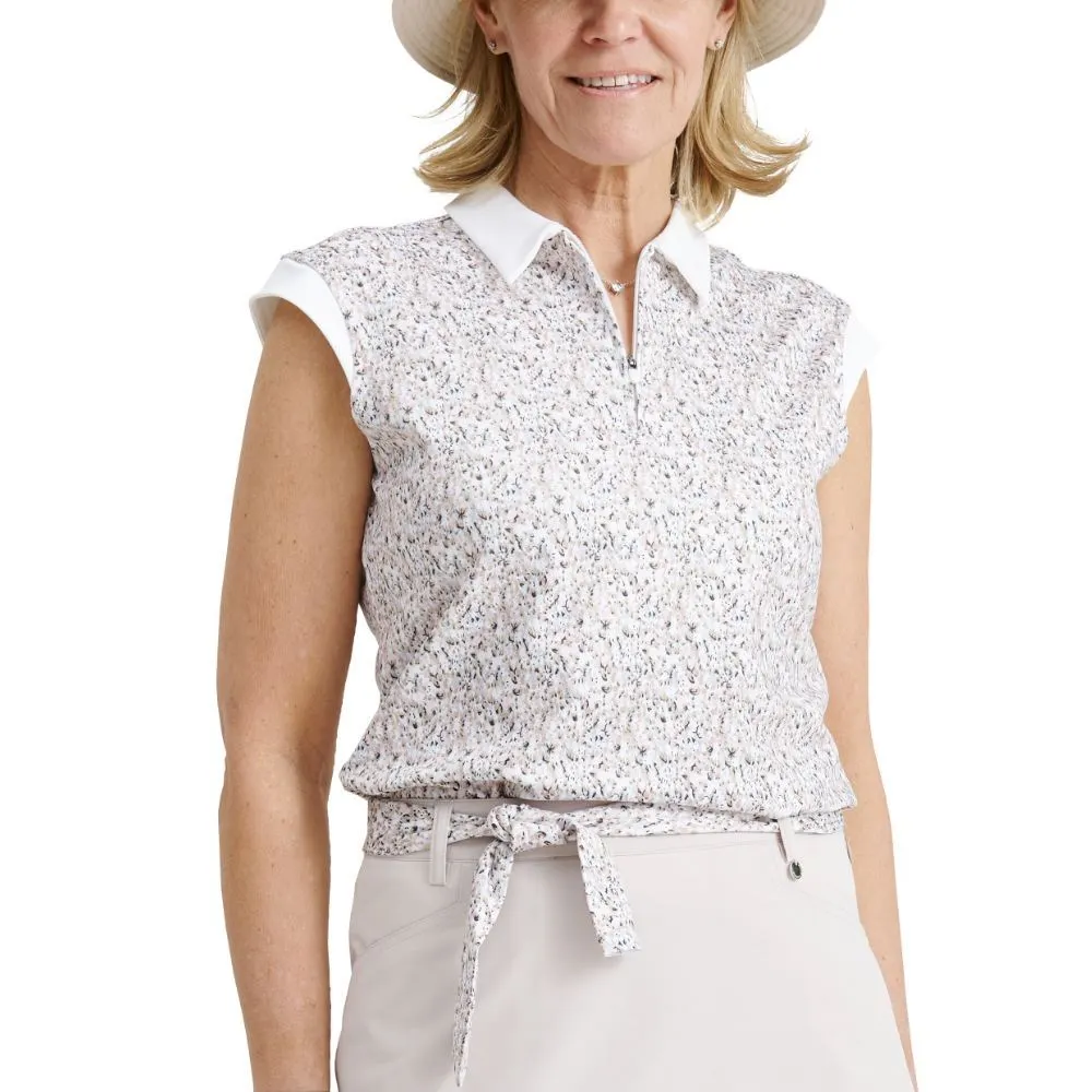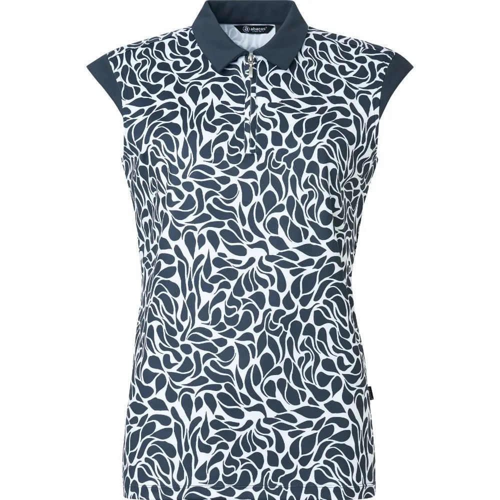 Lily sleeveless polo shirt is made of a very stretchy, lightweight fabric that also has drycool and wicking effects. With printed body and contrast collar. Zipper at neck opening and abacus logo at center back below neck. This top matches nicely with Lily and Megan’s skort.