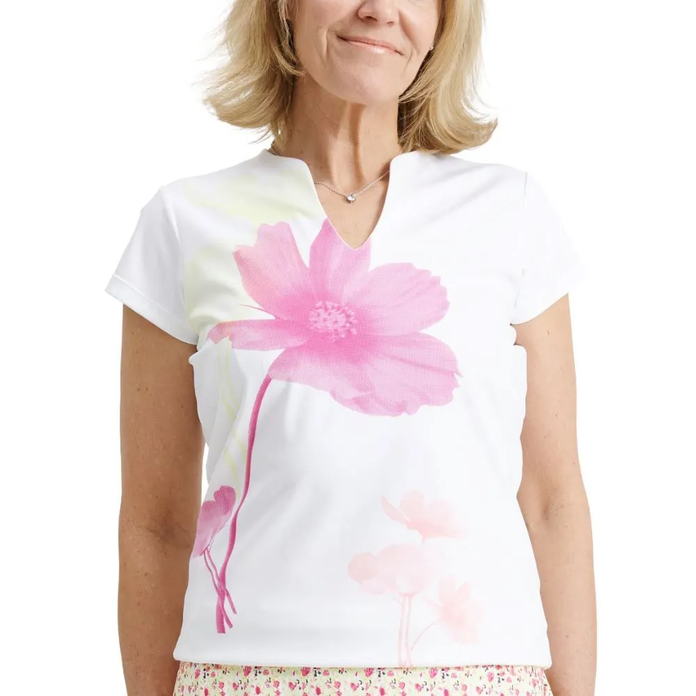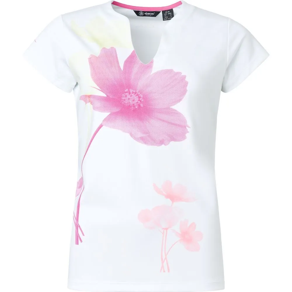 Abacus Ladies Rachel Cupsleeve Golf Polo Shirt Rachel is made of a very stretchy, lightweight fabric that also has drycool and wicking effects. Decorative flower print at front. V-neck opening. Abacus logo at the centerback below the neck.