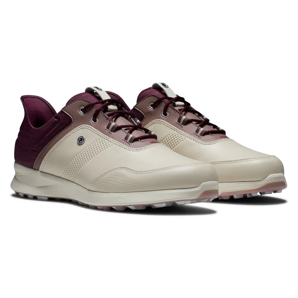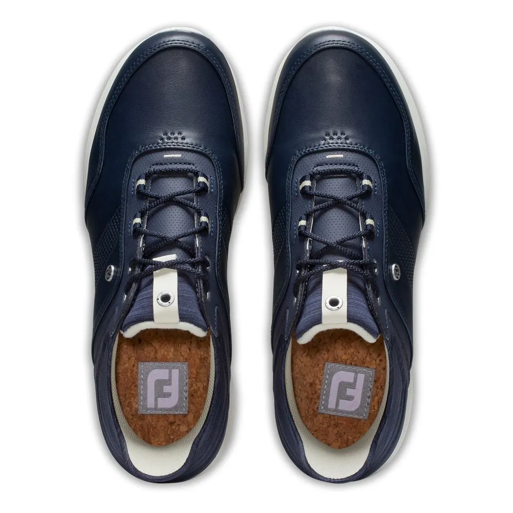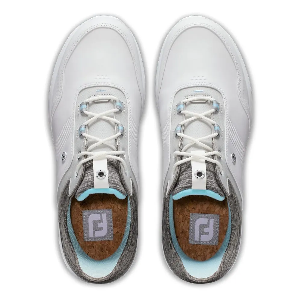 The FJ Ladies Stratos Golf Shoe gives cloud-like comfort and can be worn on and off the golf course. Featuring a proprietary cushioning system engineered from a unique compound blend that allows each shoe to absorb shock and return energy. The massive benefit of this energy return is that each shoe works for you, helping reduce foot fatigue in improving performance. Asymmetrical HeelLoc2 offers increased rear-foot support in an athletic-inspired style. The StratoFoam midsole and Cork Covered PU FitBed work together to create a plush and comfortable ride. The translucent rubber traction pieces increase traction with each stride while providing a high-end look and feel—a unique anti-channeling traction pattern designed for grip from any lie or angle. Toes can spread out and grip thanks to the fully rounded toe character and a full fit across the forefoot.