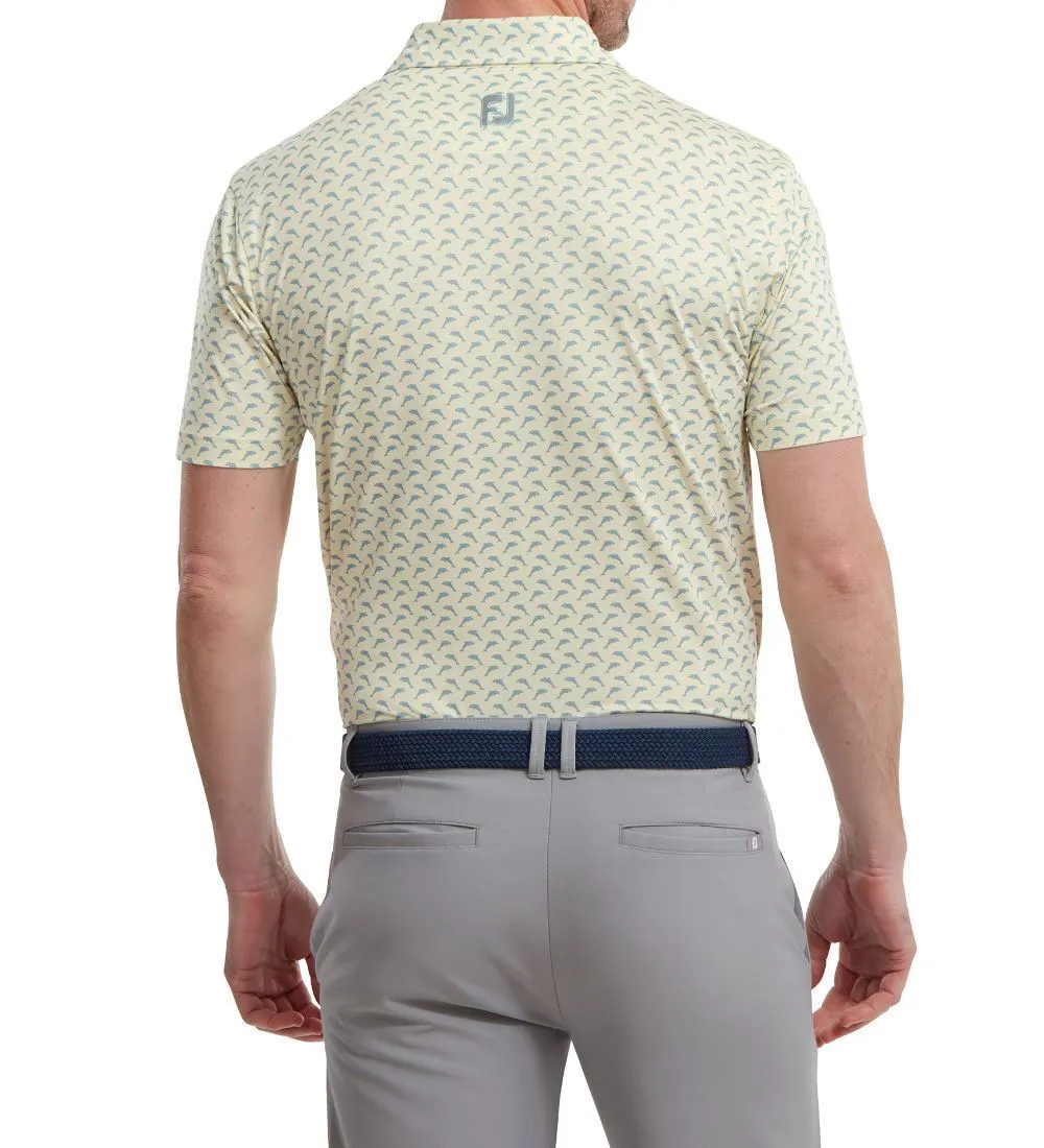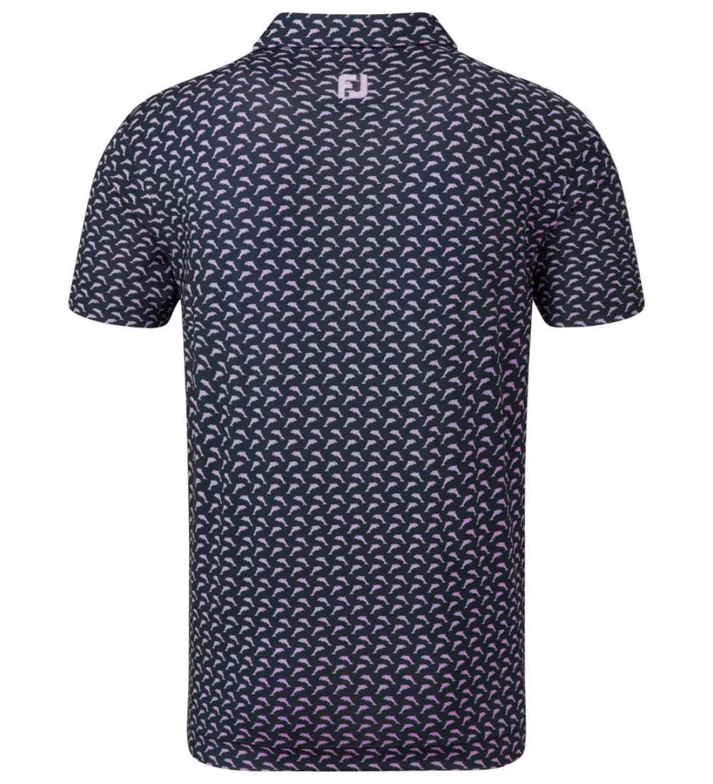 FJ ProDry Lightweight Stretch Lisle fabric. All over dolphin print pattern. Colour-coordinate rear yoke FJ logo. Moisture-wicking technology draws moisture away from the body. Easy care fabric to minimise wrinkling. SPF 30 UV protection